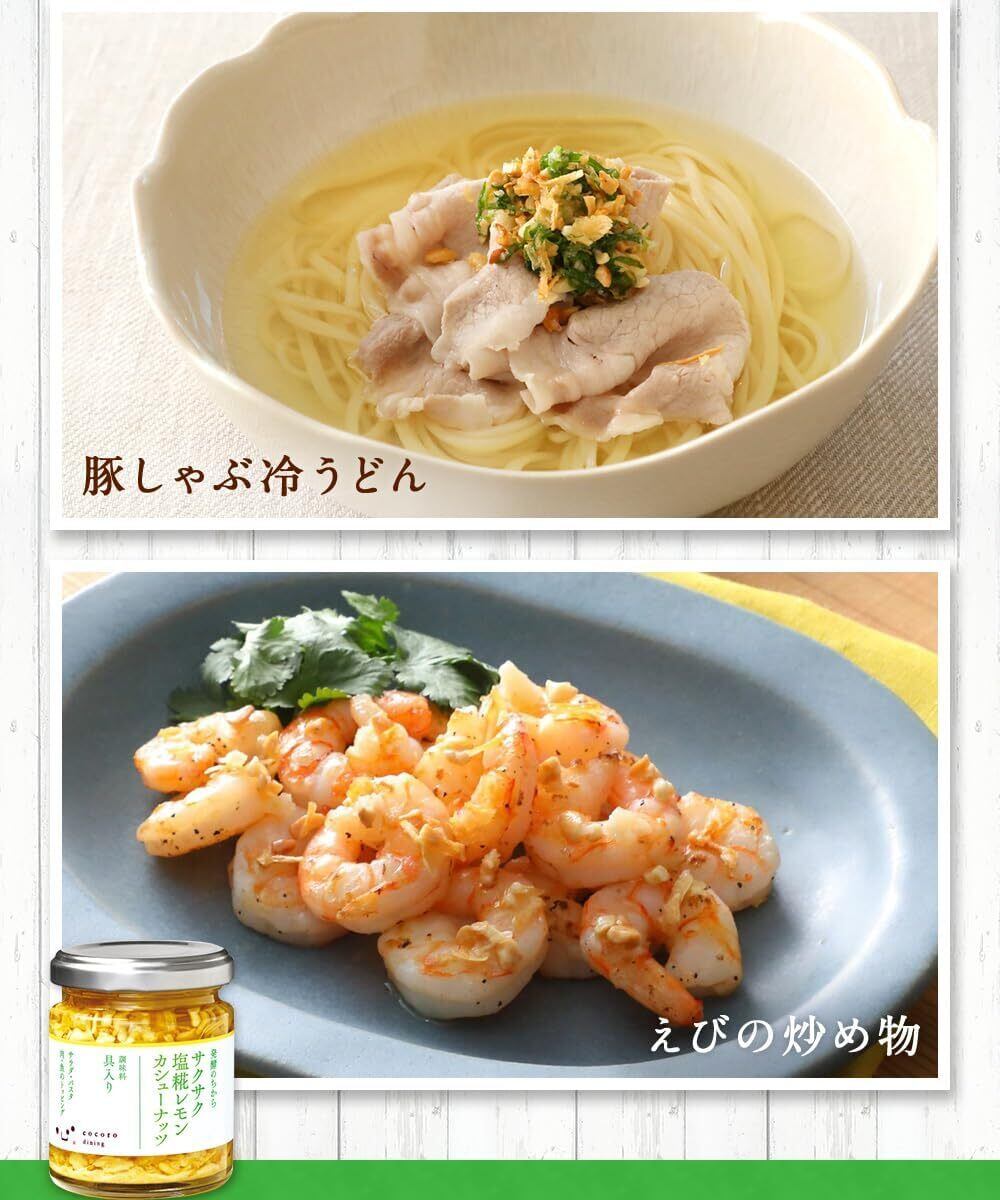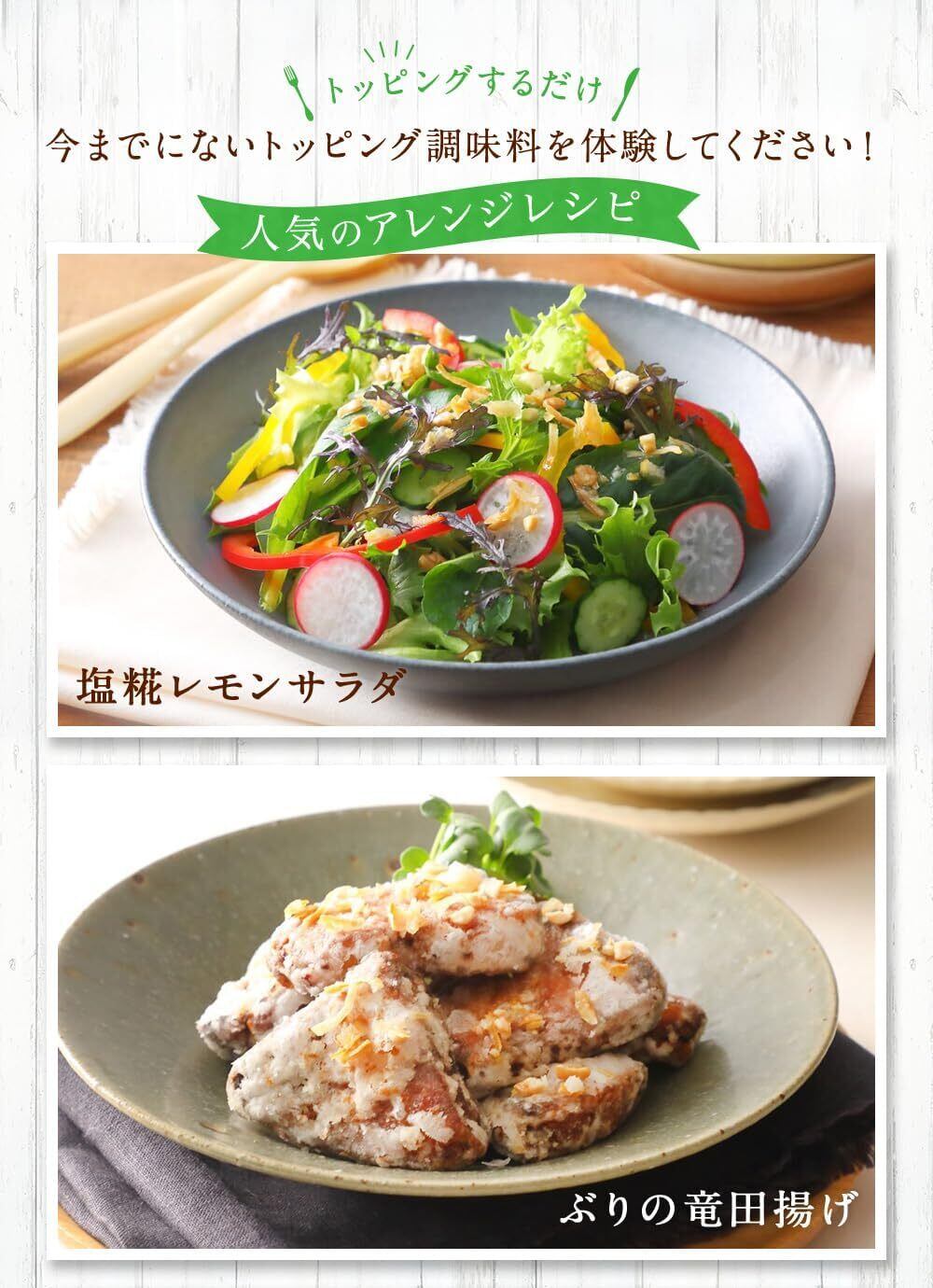 フリーズドライの塩糀をベースに、ドライオニオン、ローストカシューナッツを加えたサクサク食感のトッピング調味料です。塩粉のうま味と、瀬戸内産レモンとリンゴ酢の爽やかな酸味がお料理の味を引き立てます。