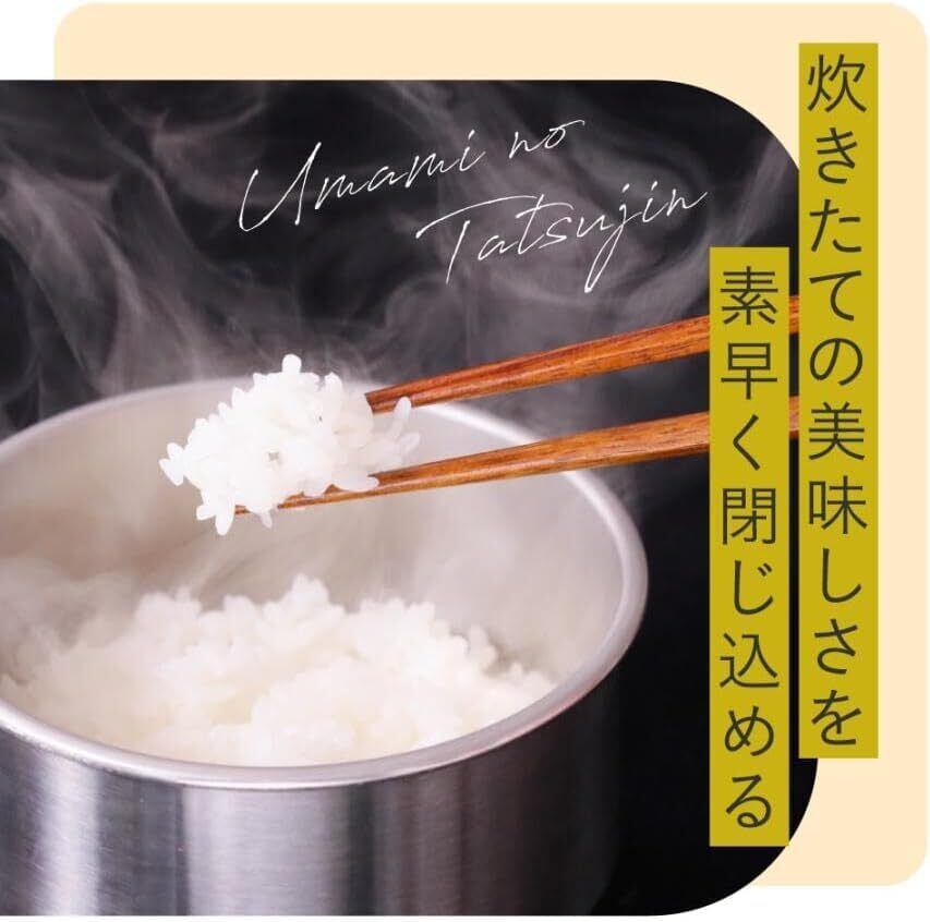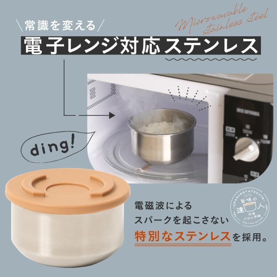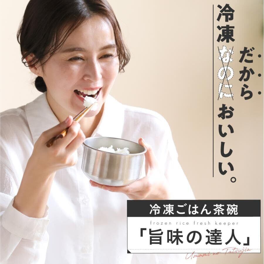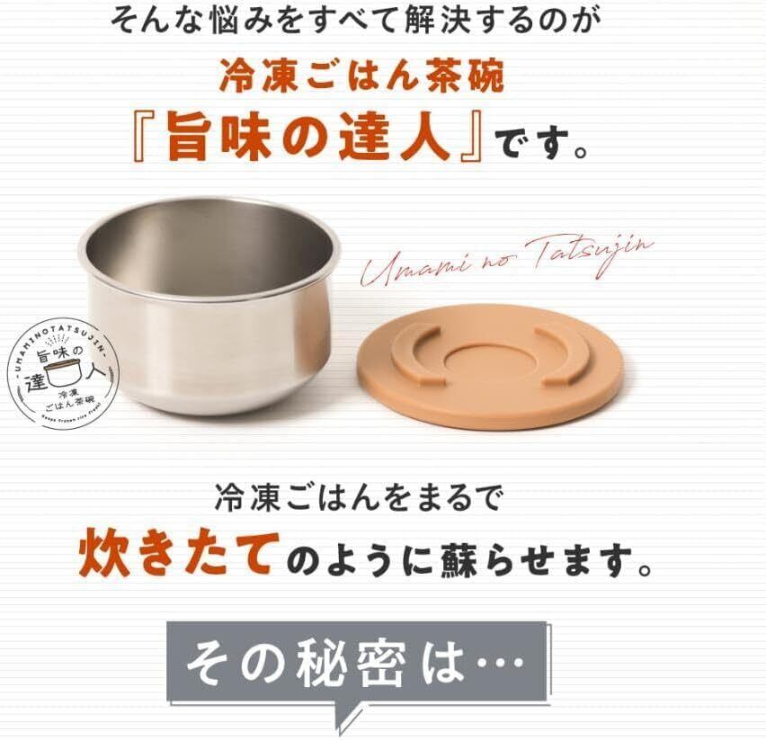 釜戸着想!レンジで温めるだけで冷凍ご飯がまるで炊き立てように美味しくなる、冷凍ご飯茶碗「旨味の達人」。 電子レンジで発熱しない!特殊ステンレス材SUS316を使用 釜戸ご飯のおいしさの秘密は強火によってもたらされる吹きこぼれるほどの沸騰力。 これを再現するため熱伝導率のいいステンレス材を使用。 電子レンジで釜戸ご飯を炊くときの沸騰力を再現しました。 高温で温めることでご飯内部の細胞が熱により壊れ、栄養成分が抽出されることによってまるで釜戸で炊いたような味わい深いごはんに生まれ変わります。 また、冷凍庫で冷やす際もステンレスの特性により冷凍庫に入れた瞬間から器が冷やされ、 素早く冷凍ご飯を作ることができます。 これにより熱々の状態で冷凍庫に入れても他の食材を傷めずに炊き立てのおいしさを閉じ込めることができます。