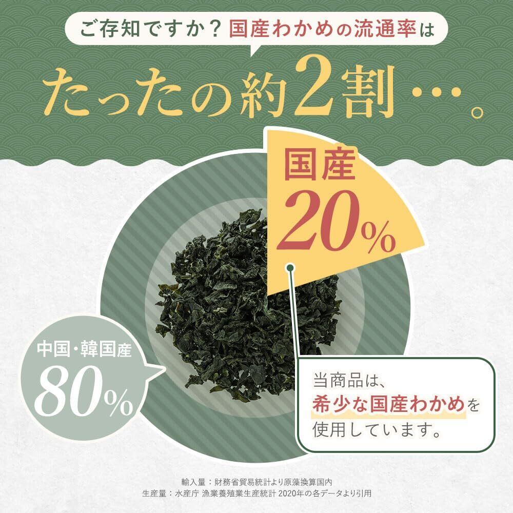 【国産原料100%使用】希少な国産わかめを使用しています。徳島県鳴門産わかめ、鳴門のうず塩、北海道産昆布粉末、北海道産てんさい糖、和歌山県産紀州南高梅を使用しています。全て日本国内で生産された原料を100%使用したわかめご飯の素です。