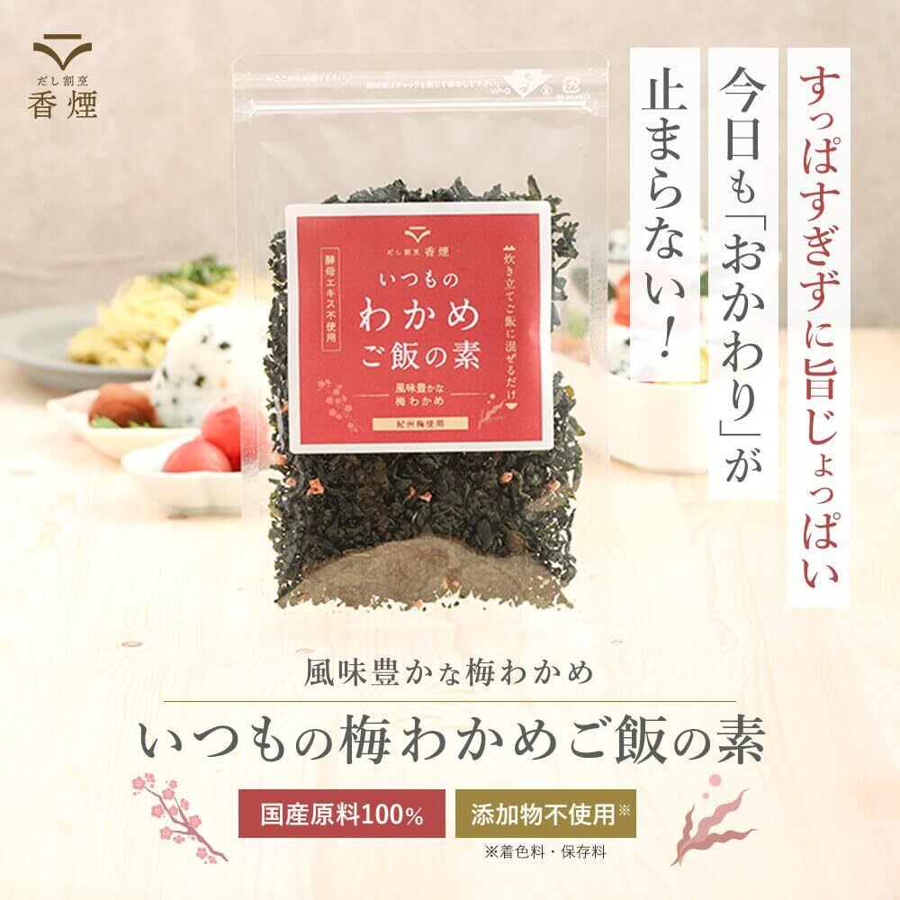 【すっぱすぎずに旨じょっぱい】今日もおかわりが止まらない!国産原料100%、保存料、着色料等添加物不使用。いつもの梅わかめご飯の素です。わかめには、毎日のスッキリをサポートする水溶性食物繊維が豊富に含まれています。梅にはクエン酸も含まれているため、健康を意識した方にもオススメです。