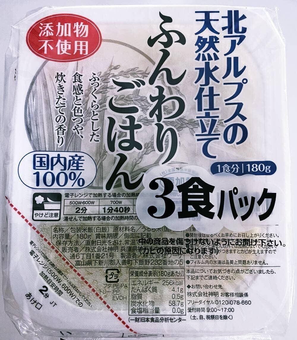 北アルプスの天然水仕立て ふんわりごはん180g ×3食パック(4個セット)国内産 炊きたての香り ふっくら つや お弁当 おにぎり レトルト キャンプ 非常食 忙しい時 少しご飯が足りない時 保存食 いつもの食卓に おまけ付き(シール)