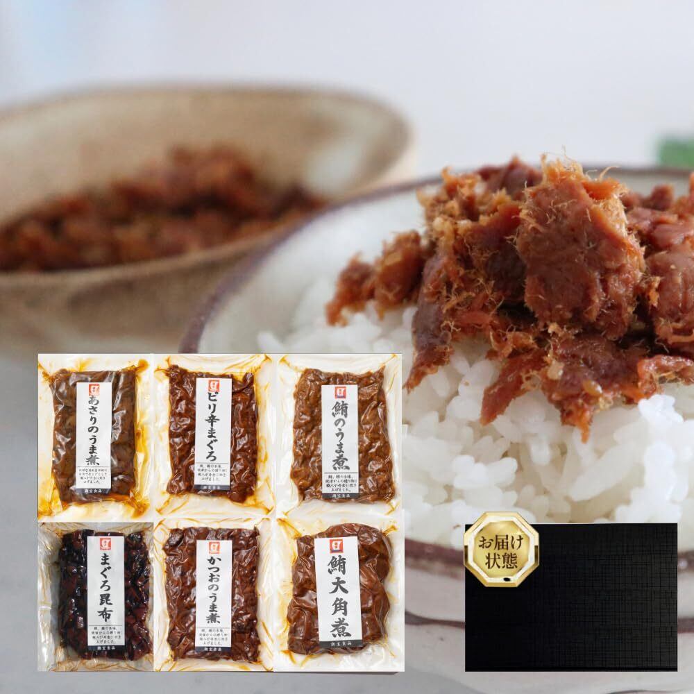 佃煮6種セット、リーズナブルな価格ながら贈られた方に喜ばれること間違いない。お中元・お歳暮の などのギフトにも最適です。ごはんのお供にピッタリなまぐろ・かつお・あさりの佃煮セットです
