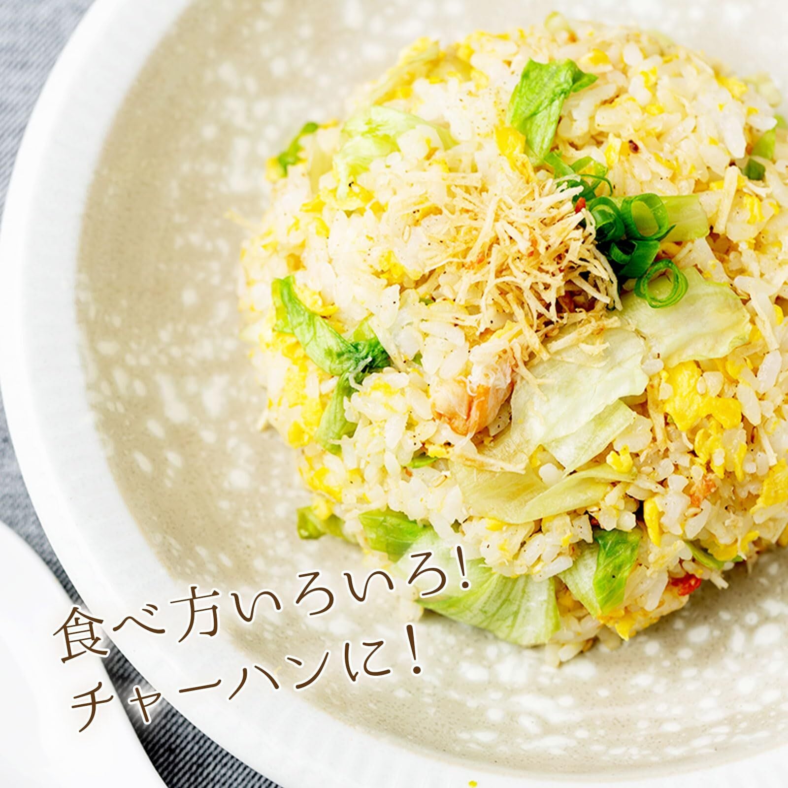 【北海ホタテ】ほたて貝柱フレーク(ほたて水煮(青森県産)、干し貝柱(北海道産))、鱈すり身加工品(鱈、小麦澱粉、その他)、ごま、ツノナシオキアミ、焦がし醤油シーズニング、ホタテエキス、砂糖、オイスターソース、ホタテ風味シーズニング、食塩/調味料(アミノ酸等)、酢酸Na、グリシン、カラメル色素、香料、増粘剤(加工デンプン)、酵素、(一部に卵・小麦・かに・ごま・さば・大豆・鶏肉・豚肉・ゼラチンを含む)