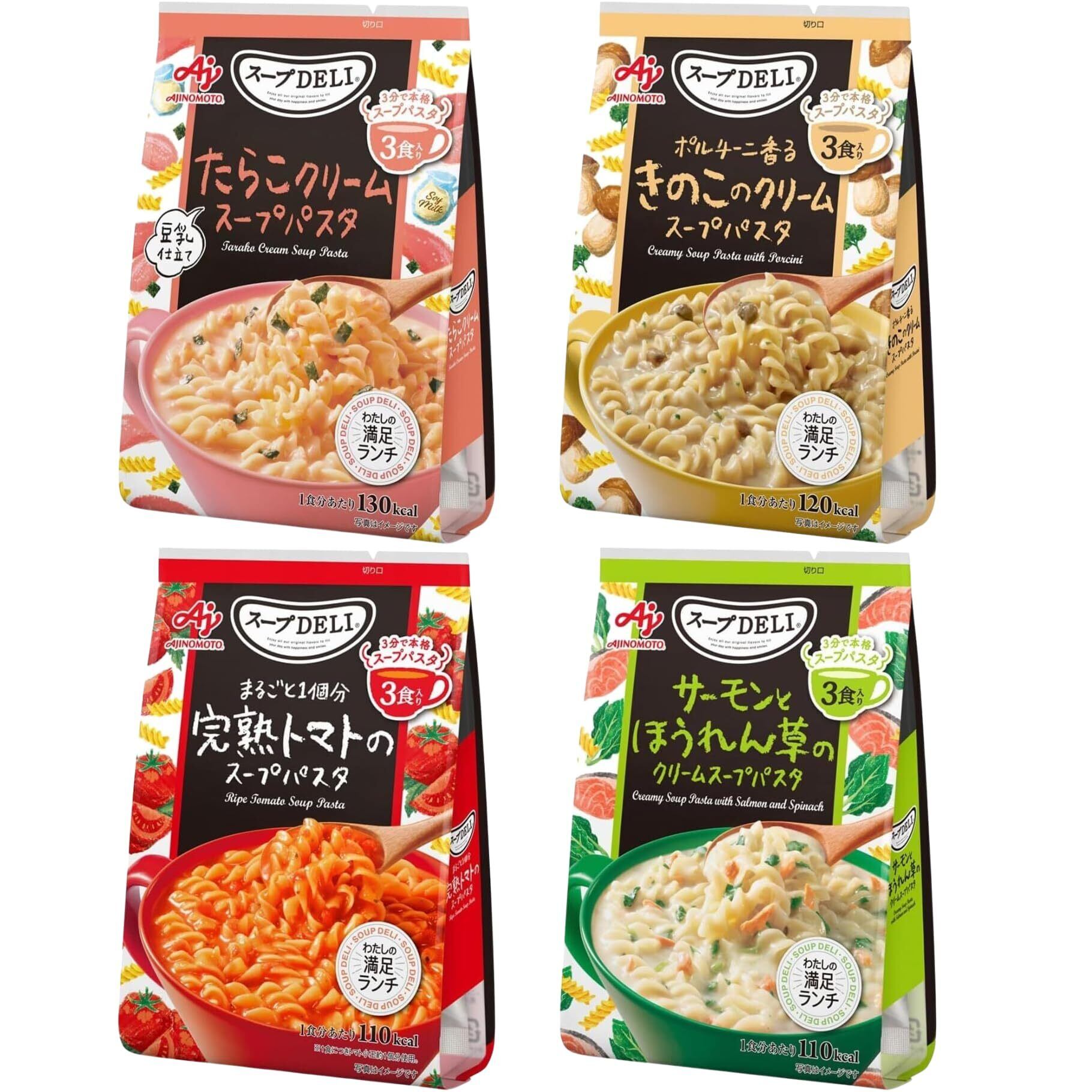 【セット買い】味の素 スープDELI 4種 アソート スープパスタ 完熟トマト・きのこのクリーム・サーモンとほうれん草・たらこクリーム 大容量各1袋 計12食