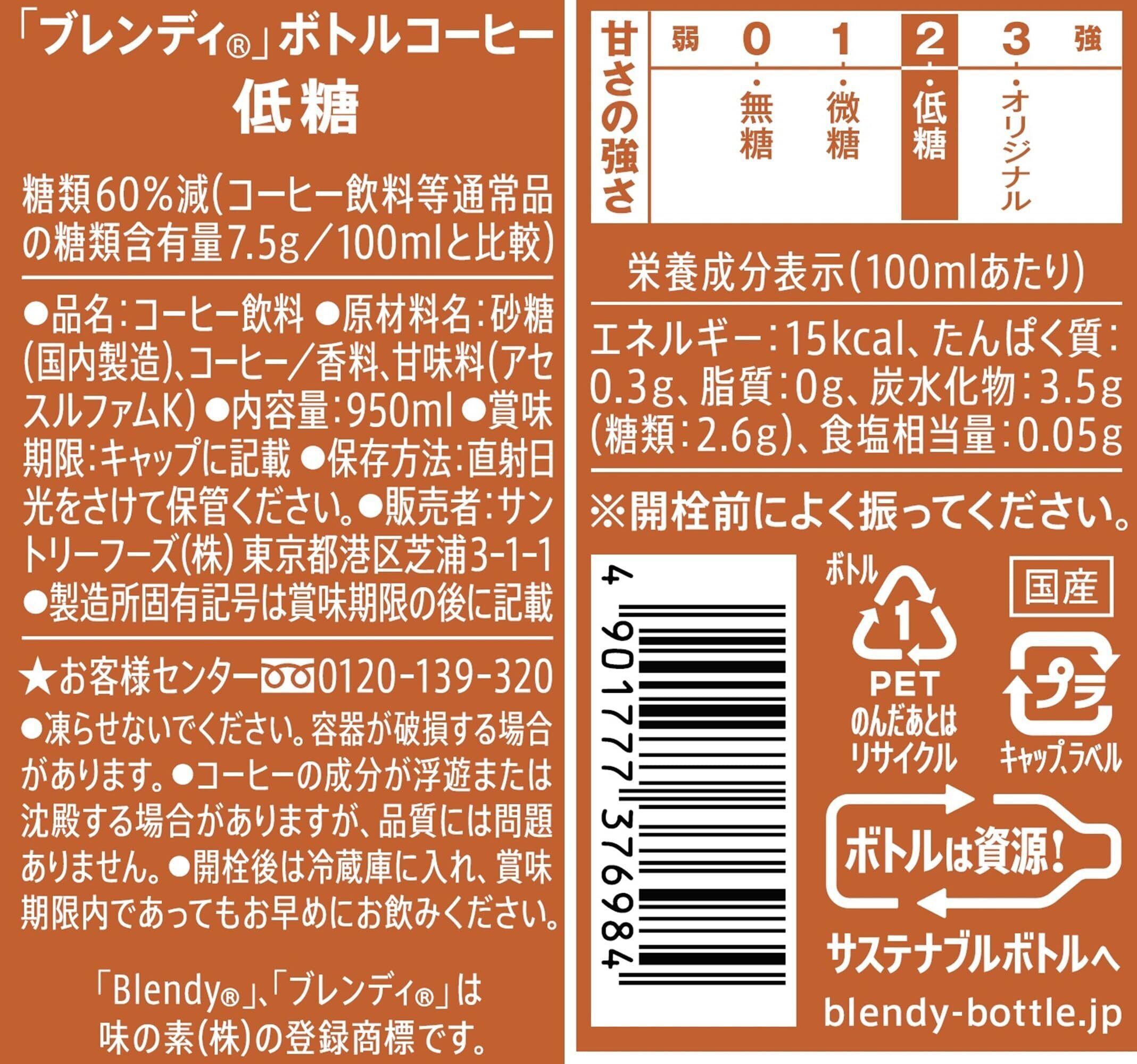 サントリー ブレンディ 液体 ボトルコーヒー 低糖 950ml×12本