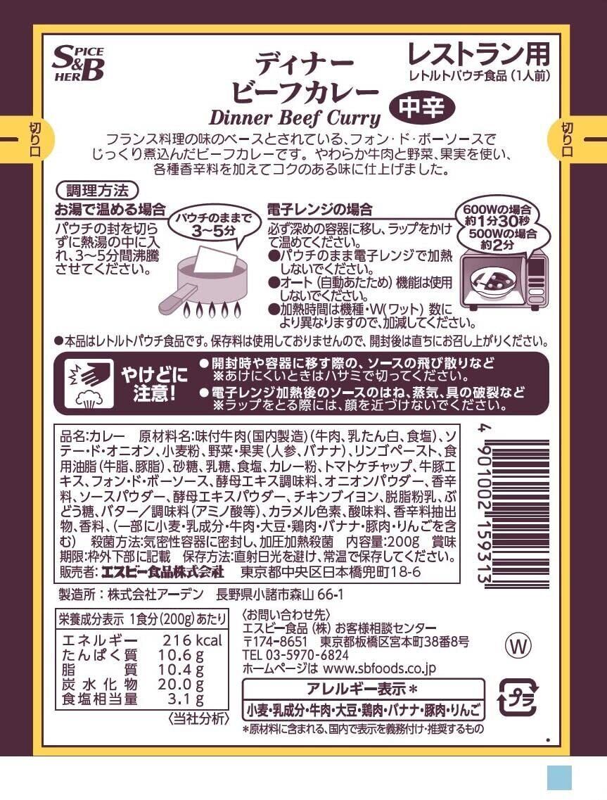 S&B エスビー食品 レストランディナービーフカレー中辛 200g ×10個