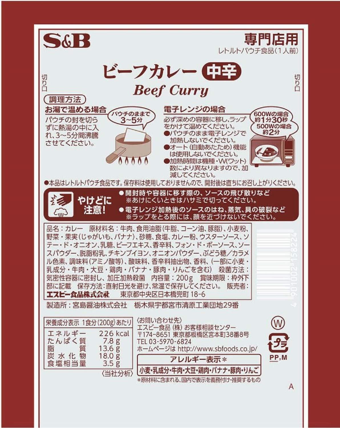 S&B エスビー食品 専門店 ビーフカレー 中辛 200g×10袋