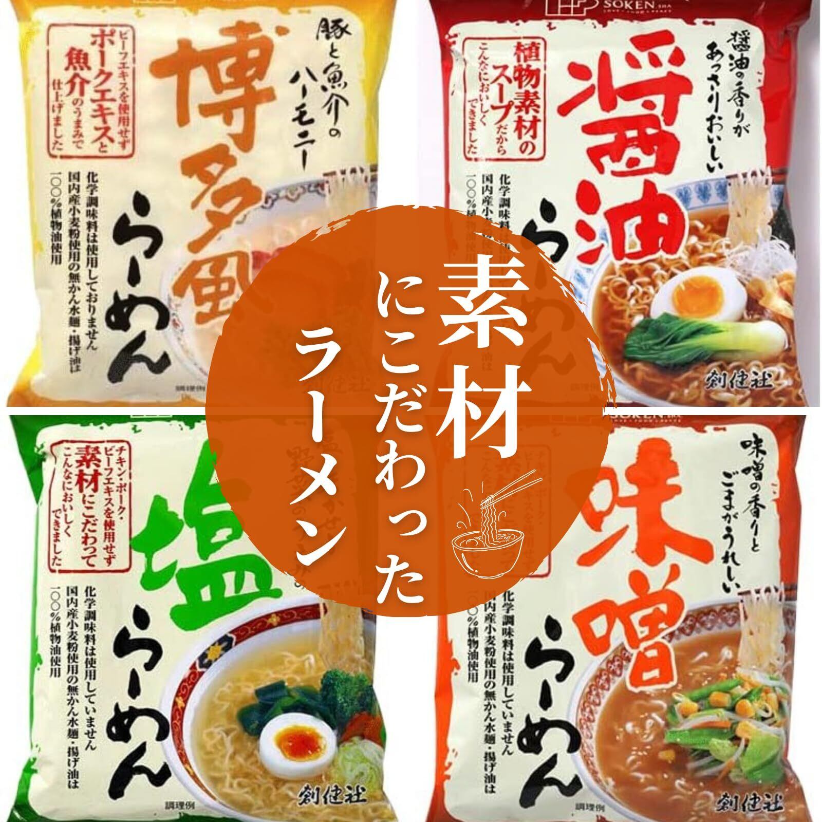 創健社 化学調味料不使用 ラーメン 4種8袋セット!100%国産小麦! 味噌×2 醤油×2 塩×2 博多風×2!無添加 無かん水 インスタント 袋麺 詰め合わせ