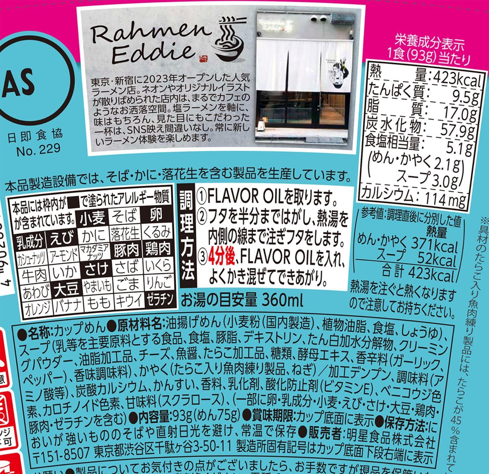明星 Rahmen Eddie監修 たらこ仕立てのチーズクリームヌードル[12個、カップ麺、ラーメン、SNS映え、東京・新宿の人気店、ミルキーな風味、93g]