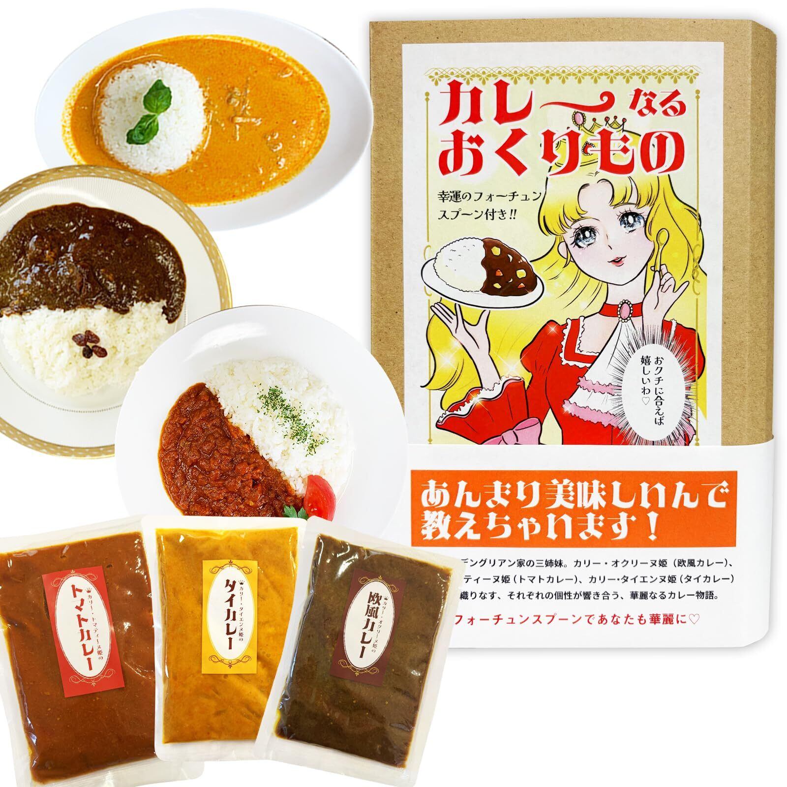 【カレーなるおくりもの】レトルト・デングリアン家三姉妹の華麗なる食卓 レトルトカレー3種入り(欧風・トマト・タイ)面白いギフト・かわいい贈り物(誕生日/お見舞い/お礼)