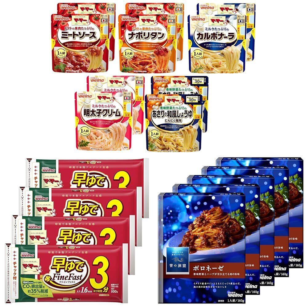 マ・マー たっぷりシリーズ1人前パスタソース5種類×2個 電子レンジで簡単 パスタソースセット(ミートソース、ナポリタン、カルボナーラ、明太子クリーム、あさりの和風しょうゆにんにく風味) + マ・マー 早ゆで3分スパゲティ1.6mm チャック付結束タイプ 500g×4個 + 青の洞窟 香味野菜とハーブ引き立つボロネーゼ 140g×5個 パック【セット買い】