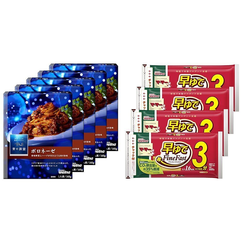 青の洞窟 香味野菜とハーブ引き立つボロネーゼ 140g×5個 パック + マ・マー 早ゆで3分スパゲティ1.6mm チャック付結束タイプ 500g×4個【セット買い】