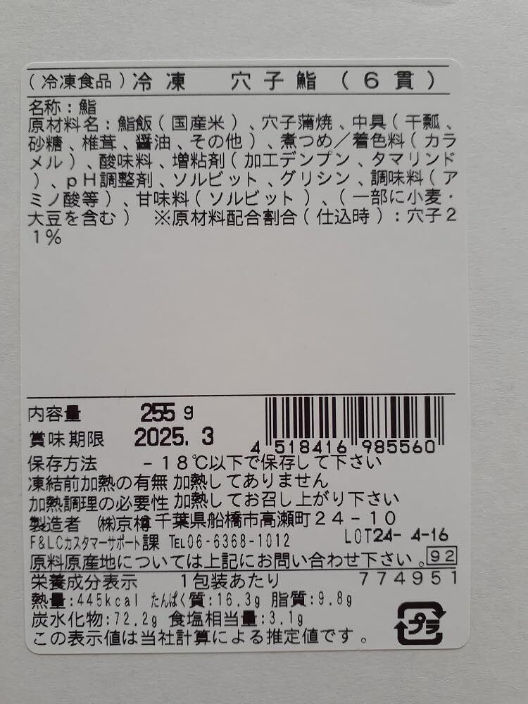 [冷凍] 京樽 穴子鮨 6貫×2袋